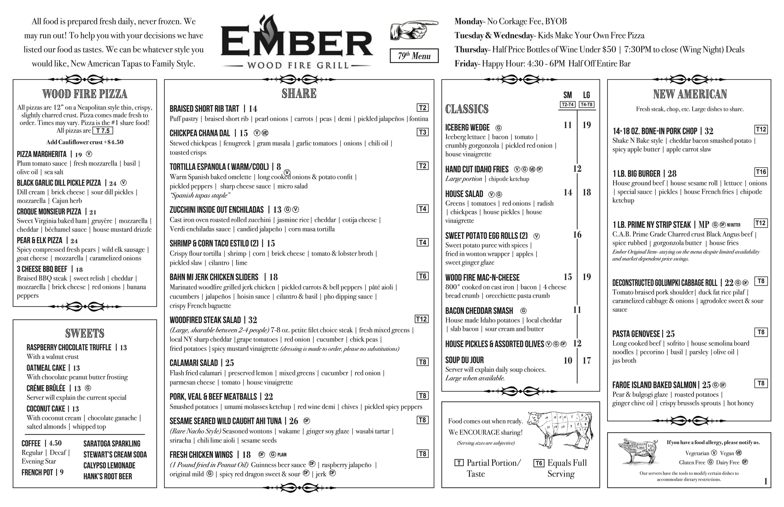 Ember is a hospitality forward, non-traditional, sharing restaurant. All of our food, wood-fired pizzas, steaks, chops, pasta, and seafood, is prepared fresh and is designed to be served when it is ready. Therefore we encourage sharing. Sharing is a very social and economical way to dine. Our style is not the traditional: “Soup, Salad, Appetizer, and then Entrée.” We strive to be fresh, simple, and unique. Ember offers a great selection of local craft beers and finger lakes wines. We have a full bar and unique seasonal cocktails, as well as a large dinning patio and bar with live entertainment in the summer.